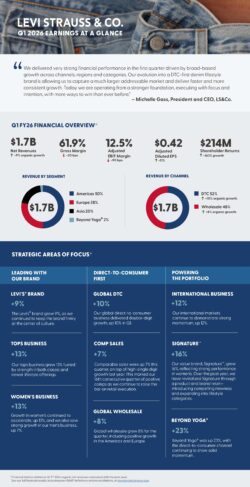 “We delivered very strong financial performance in the first quarter driven by broad-based growth across channels, regions and categories,” said Michelle Gass, president and CEO of LS&Co. “Our evolution into a DTC-first denim lifestyle brand is allowing us to capture a much larger addressable market and deliver faster and more consistent growth. Today we are operating from a stronger foundation, executing with focus and intention, with more ways to win than ever before.”